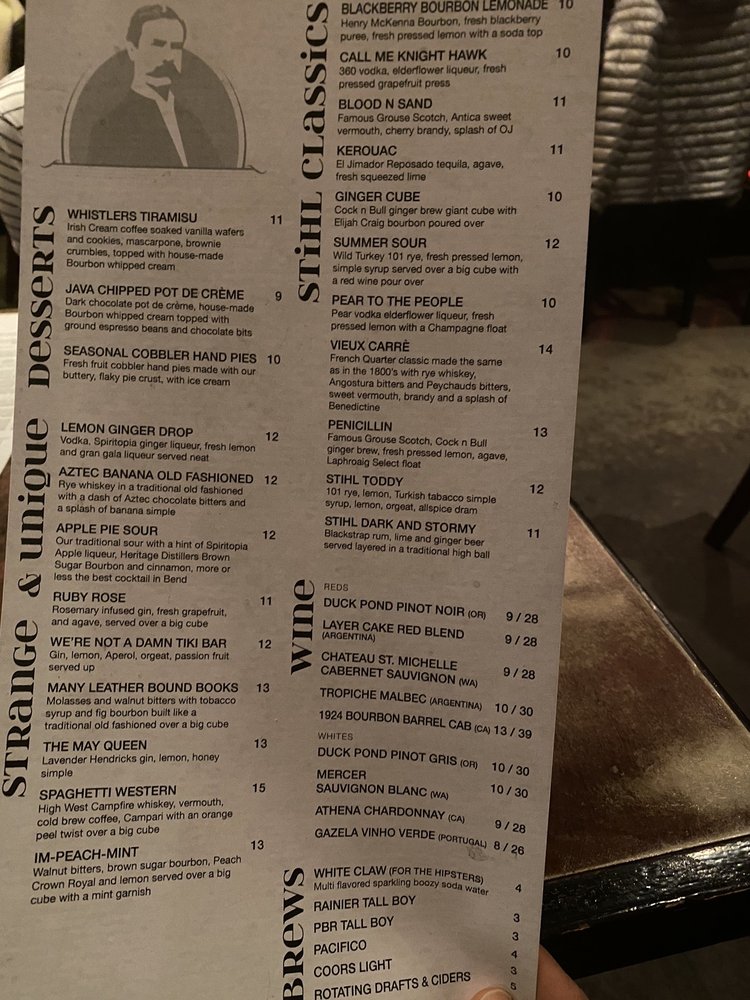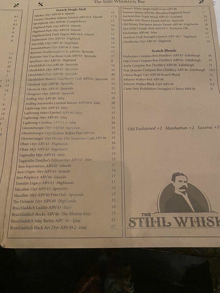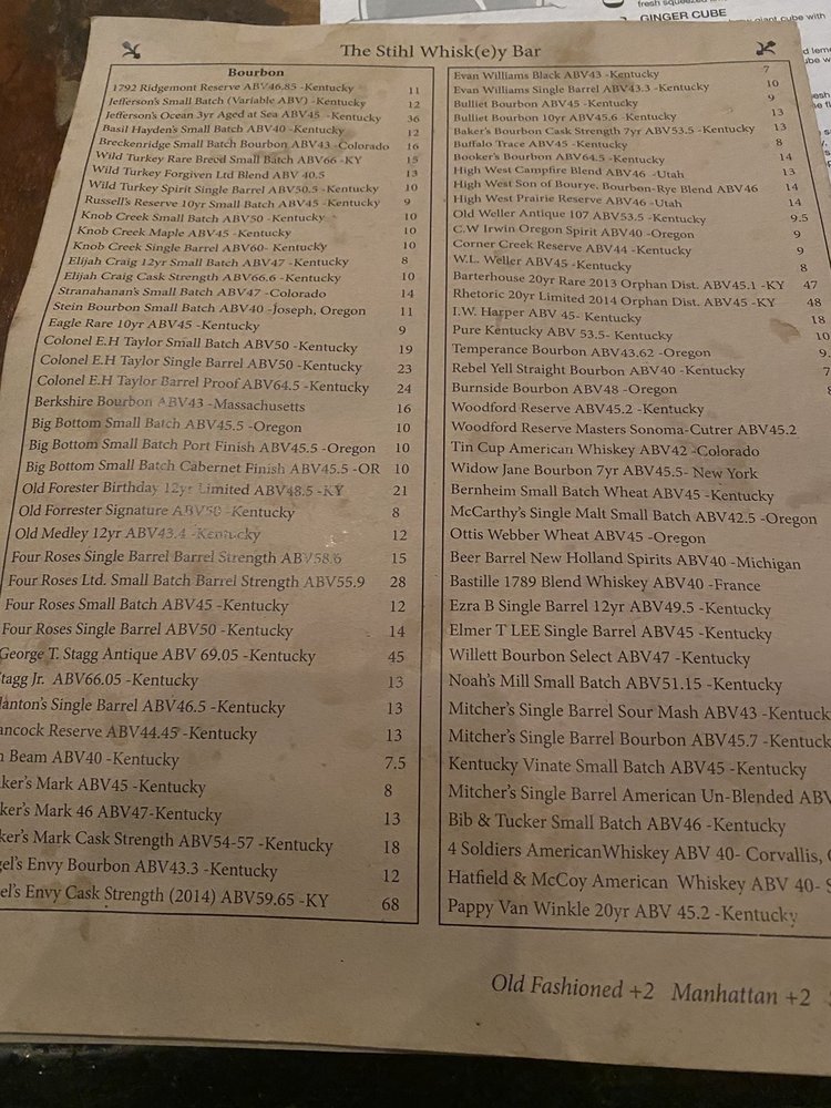 Introducing The Stihl Whiskey Bar, located in Bend, OR, a hidden gem for whiskey enthusiasts and casual diners alike. Boasting a cozy ambiance with a focus on craft cocktails and an extensive bourbon selection, this bar offers a unique experience for those looking to unwind with a quality drink. Customer reviews rave about the burgers and sweet potato fries, exceptional service, and cool vibes of the bar. Whether you're a whiskey connoisseur or just looking for a fun night out, The Stihl Whiskey Bar has something for everyone. Don't miss their famous whiskey sour or the well-curated beer taps. For a night filled with great drinks, good company, and a welcoming atmosphere, The Stihl Whiskey Bar is the place to be.